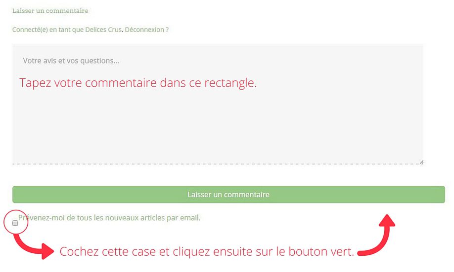 Déroulez jusqu’au bas de la recette où vous verrez un grand rectangle gris, dans lequel vous pouvez taper votre commentaire. Avant de cliquer sur le bouton vert pour envoyer votre commentaire, cochez la case en dessous pour être prévenu par courriel lorsque quelqu’un répond à votre commentaire.
