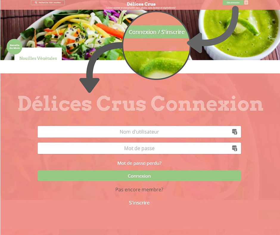 Si vous êtes déjà en train de naviguer sur le site de Délices Crus, cliquez d’abord sur le bouton vert Connexion/S’inscrire en haut à droite puis, dans la fenêtre qui s’ouvre, entrez vos accès d’utilisateur Simplement Cru (voir ci-dessous) et cliquez ensuite sur Connexion.