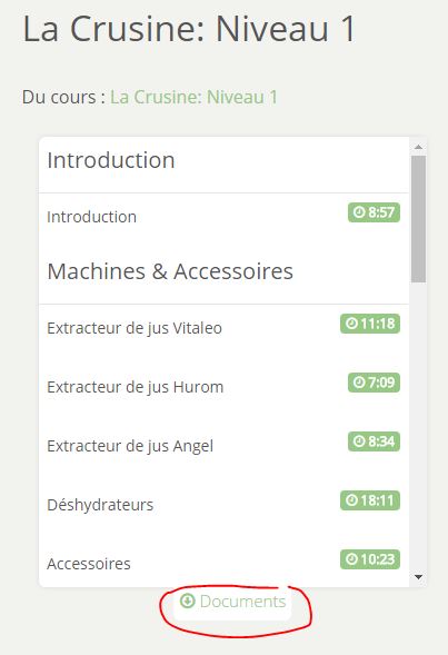 Pour consulter les documents associés à chaque cours, clique sur le bouton Documents (sous la liste des vidéos) et une fenêtre s’ouvrira avec le choix des documents.