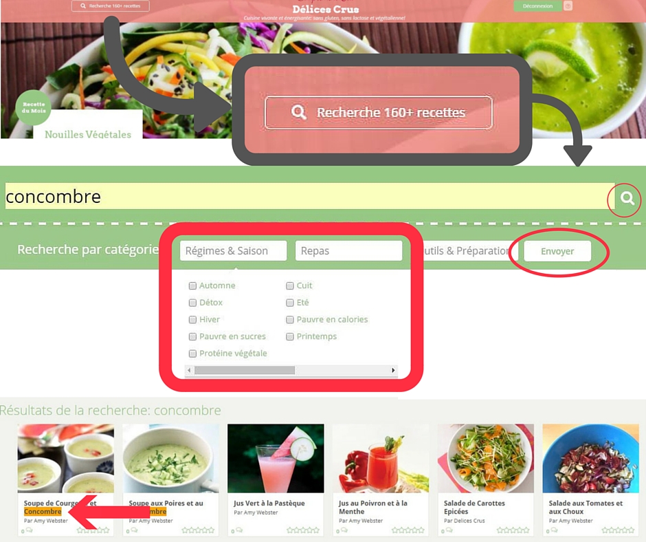 ATTENTION! Si vous avez d’abord cherché par mot clé mais n’êtes pas satisfait des résultats et souhaitez plutôt passer à la recherche par catégorie (ou vice-versa), le site indiquera qu’aucun résultat n’a été trouvé. Pour résoudre le problème, vous devez retourner à la page d’accueil du site en cliquant sur Délices Crus dans la bande corail et recommencer la recherche.