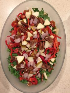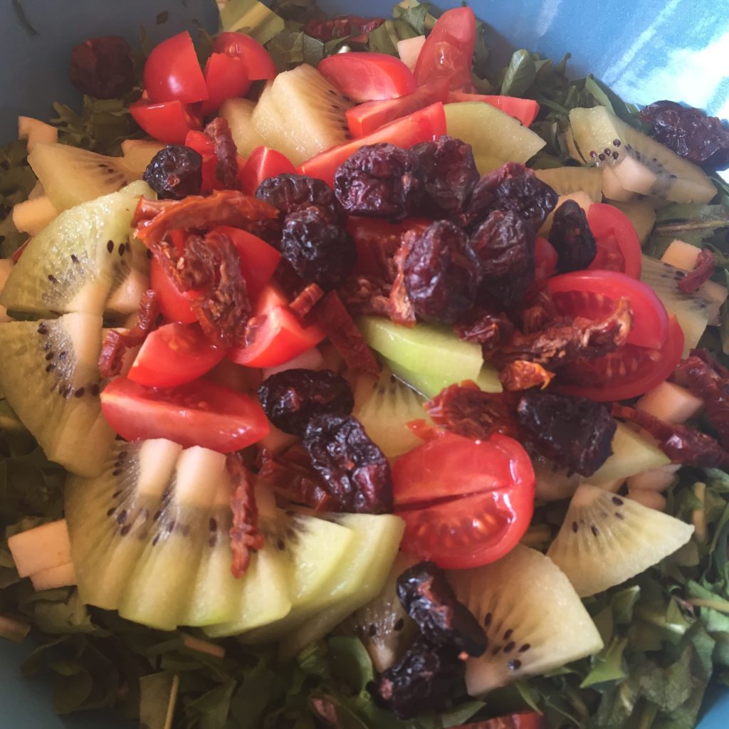 A part la salade verte, il me semble que les spaghettis de courgette sont trop fades servis tous seuls. Alors je m’empresse de découper en dés quelques ingrédients que je trouve dans mon frigo :